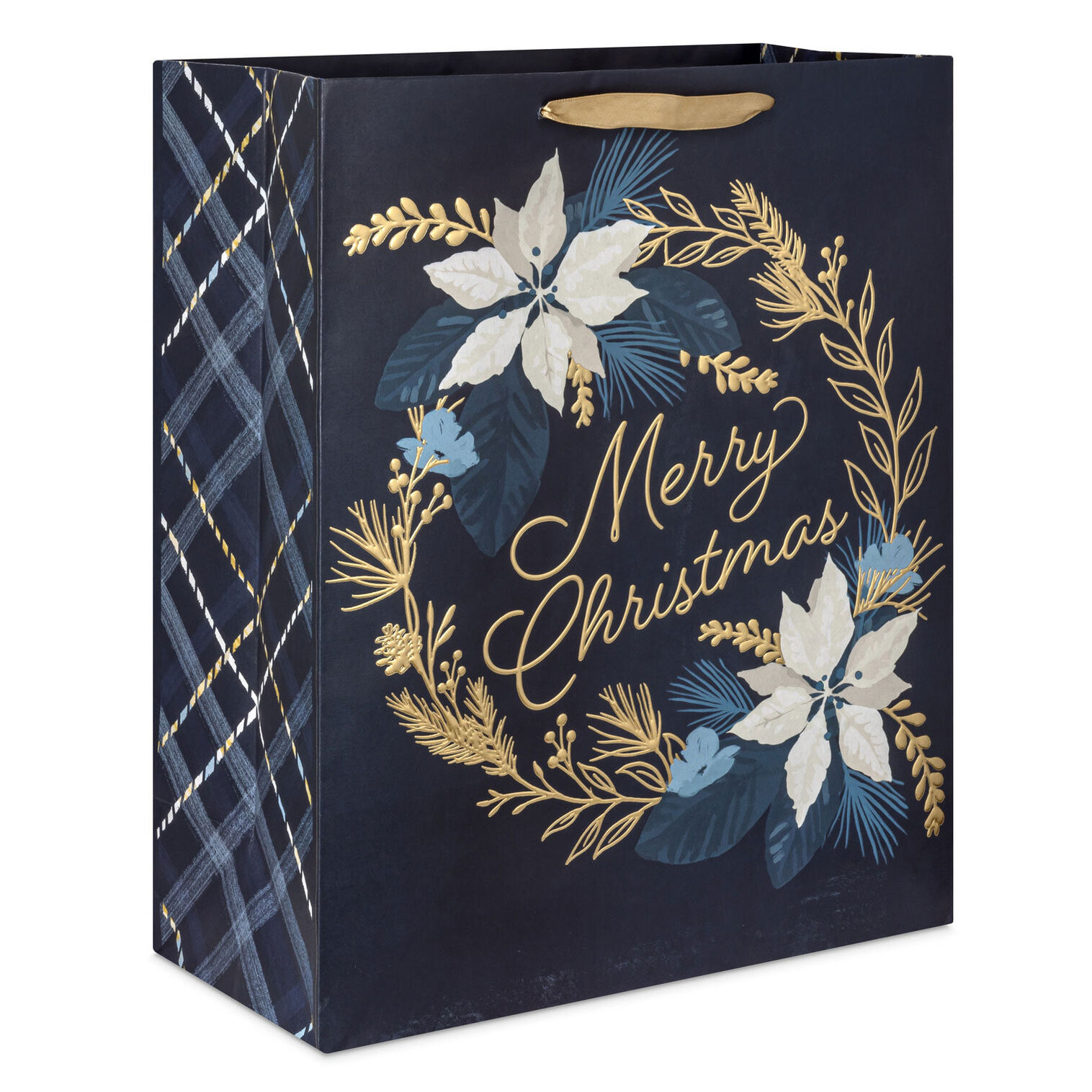 Deliver a luxe gift with this elegant floral wreath-designed gift bag in navy, gold and white. Extra-large gift bag features a wreath of white poinsettias with blue and gold foil botanicals on a navy blue background and a linen-textured finish. Christmas bag is perfect for sharing with family and friends