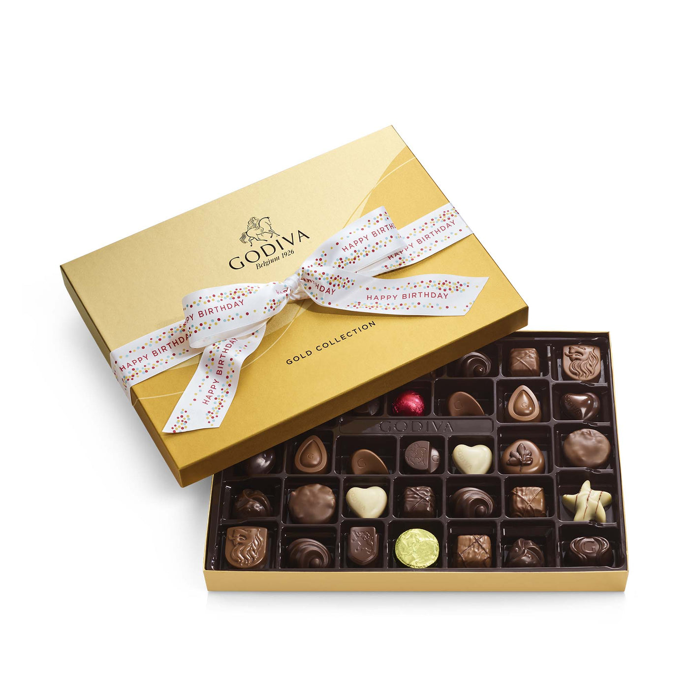 Make birthdays unforgettable with GODIVA’s Assorted Chocolate Gold Gift Box, which wrapped in a cheerful “Happy Birthday” ribbon and contains 36 pieces. This elegant box features a premium assortment of classic chocolates, including velvety ganaches, creamy caramels, luscious pralinés, and a variety of nuts and fruits in milk, dark, and white chocolate. Each piece offers a delightful combination of rich, smooth textures and indulgent flavors.