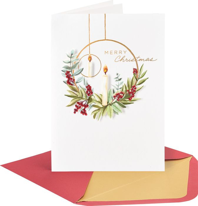 Spread a little Christmas spirit with premium holiday boxed cards from Papyrus! This beautiful box set features 8 cards with identical handmade designs of a wreath and candles as well as metallic foil accents, layered paper attachments, and sparkling gems. Inside, a simple wish for happiness and peace. Send them to relatives, friends, co-workers, and neighbors. It comes with 8 individual envelopes and 8 gold foil Papyrus seals. Extra postage required.