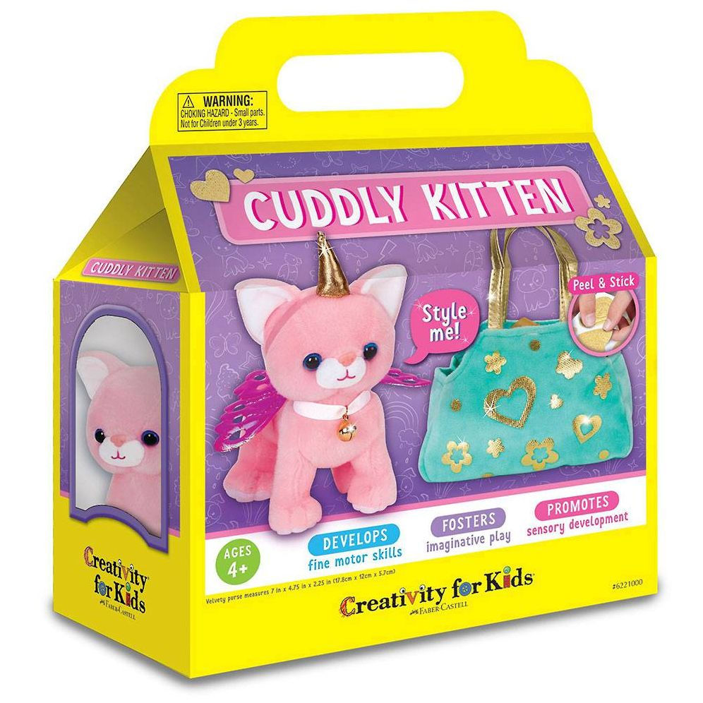 This cuddly kitten will be your purr-fect crafting companion. Decorate this plush kitten and velvety pet carrier with an array of adorable accessories including: ribbon and bell collar, metallic gold stickers, unicorn horn and shiny butterfly wings. No glue, no mess! Develops fine motor skills, fosters imaginative play and promotes sensory development. Designed to comfort and cuddle, your completed carrier measures 7” w x 4 ¾” h x 2 ¼” d and the kitten measures 6 ½” w x 6” h. Choking Hazard – Small parts not for children under 5