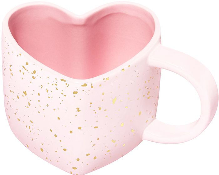 This beautiful heart shaped mug will make a great gift or add just add some love to your current collection. Features a bright pink color with gold flecks in a unique heart shape with handle.