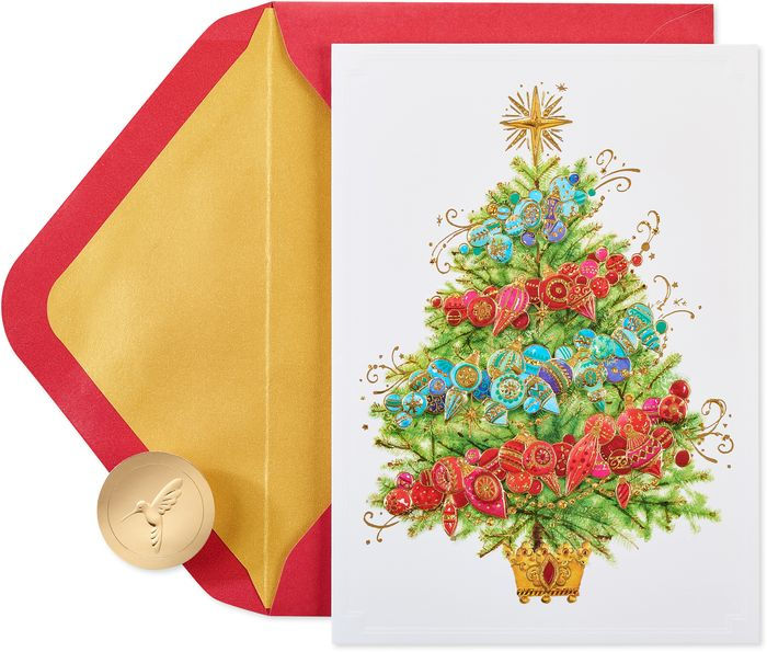 Jewel-toned ornaments on a beautiful Christmas tree add timeless elegance to this holiday card from Papyrus. This unique design is embellished with foil and deep embossing. Set of 12 cards comes with coordinating lined envelopes, gold Papyrus hummingbird seals and a box with acetate lid.