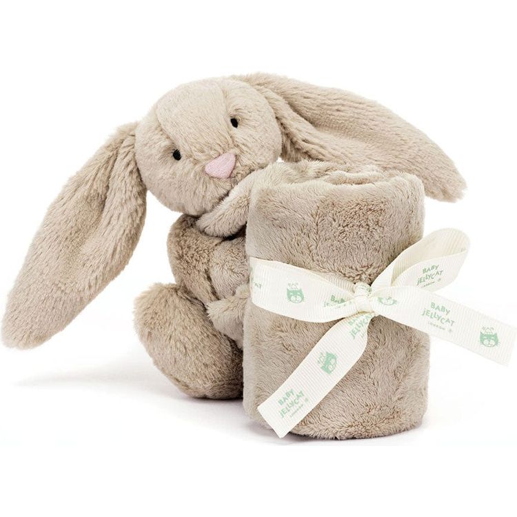 A perfect gift for newborns, the Bashful Bunny Soother is our most loved Bashful Bunny in a soft fur, with long lopped ears, a pink suedette nose and stitched eye detail holding a square shaped soother, un-stuffed and irresistibly soft to touch. Made from recycled fibers and neatly rolled up and presented with a Baby Jellycat grosgrain ribbon.