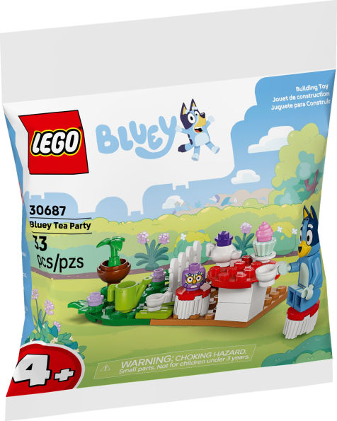 Bluey and Chattermax enjoy a tea party on the porch with a teapot, cups, cupcake and a red toadstool seat. After tea, Bluey waters the plants in the garden. For Ages: 4+ WARNING: Choking Hazard: Small Parts. Not for children under 3 years old"