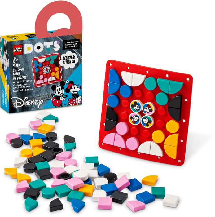 Design, share, repeat Treat a Disney or arts-and-crafts fan with this LEGO® DOTS Disney Mickey Mouse & Minnie Mouse Stitch-on Patch (41963) kit. The creative fun starts when they open the box Bold designs anywhere Kids boost their imagination and design skills as they create with this kit, using a 6×6 stitch-on patch in red, plus bold colored tiles and Mickey & Friends-decorated tiles Creativity in a box This set works on its own for quick, imaginative originality. Kids can also use the LEGO® DOTS Extra DOTS Series bags (sold separately) to expand their designs Treat for ages 8+ Arts-and-crafts fans will love this customizable kit. The sturdy stitch-on patch and colored and decorated tiles make a gift for creative kids Pocket-sized portability With the patch measuring over 2 in. (5 cm) square, theres lots of space for kids to be creative and show off their Disney-inspired style: any time, any place Decorating starts right away Easy-to-follow inspiration on the packaging makes creating a snap, with tiles in teal, blue, orange and pink, plus Mickey & Friends-decorated tiles to make a statement Design confidence and freedom This LEGO® DOTS kit represents open creativity. The ready-to-decorate patch offers bite-sized chances to build childrens ingenuity and poise through fun Unlimited play and self-expression LEGO® DOTS sets bring the joy of LEGO play to a new group of kids through creating and customizing wearables and other items Uncompromising quality Ever since 1958, LEGO® components have met stringent industry standards to ensure they connect consistently Safety first LEGO® components are dropped, heated, crushed, twisted and analyzed to make sure they meet rigorous global safety standards