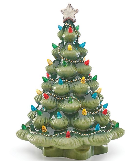 Everyone's favorite centerpiece for decades, this Treasured Traditions tree is a piece of holiday nostalgia that you can pass down from generation to generation. Crafted of stunning ceramic material, the carved tree figurine features hand-painted detail and is topped with a star at the top for a luminous finish. This tree comes with multi-colored bulbs throughout for a cheery glow that will steal the spotlight on your mantel. Porcelain Carved tree figurine features hand-painted detail Topped with a star at the top for a luminous finish Beautiful glow with the multi-colored bulbs Perfect for your mantle Wipe clean with a soft cloth Approx. 10.75" x 13.5"