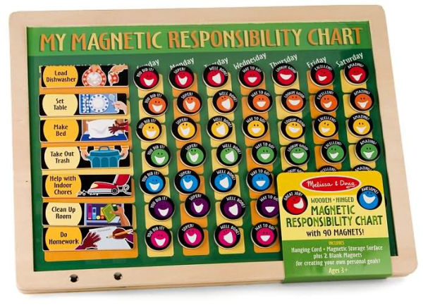 Wooden, hinged Magnetic Responsibility Chart with 90 magnets! Comes with hanging cord and magnetic storgae surface plus 2 blank magnets for creating your own personal goals.