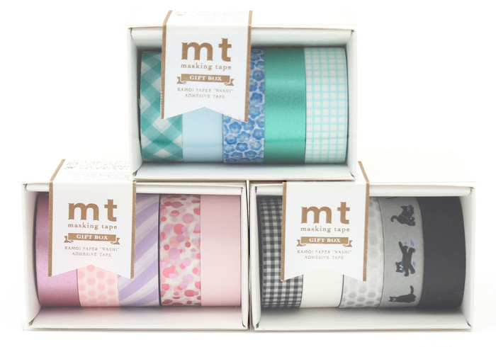 MT Masking Tape set. Includes 5 Kamoi paper "washi" adhesive tape in complimentary shades of black and white and themed patterns