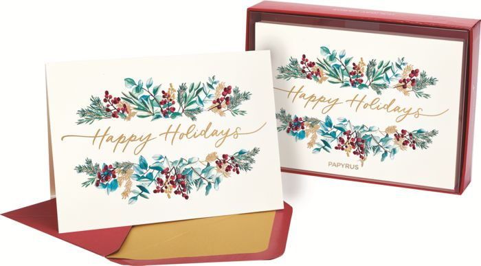 Front cover: Happy Holidays Inside message: Wishing you and yours the very best of the season Package includes 12 cards and coordinating envelopes per box and comes with gold Papyrus hummingbird seals. Cards measure 5 in. x 7 in. Papyrus boxed cards features foil, glitter and embossing, with lined envelopes and gold seals in a red box.