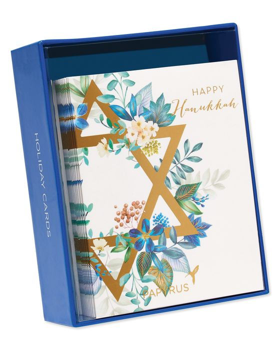 Front cover: Happy Hanukkah Inside message: May this Season of Light fill your heart and home with joy. Package includes 20 cards and coordinating envelopes per box and comes with gold Papyrus hummingbird seals. Cards measure 3.75 in. X 4.75 in. Papyrus boxed cards features foil and embossing, with lined envelopes and gold seals in a red box.