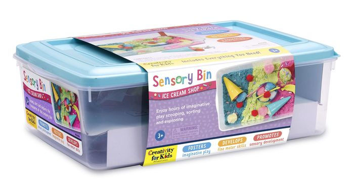 Foster imaginative play with the Ice Cream Shop Sensory Bin. This self-contained play bin is the ultimate sensory experience. Develop and practice find motor movement with scooping pretend ice cream in a bowl or cone. Includes easy to shape and mold Sensory Sand in 3 colors, ice cream scoop, bowl, spoons, pom poms, ice cream cones, rainbow beads and foam banana. Conveniently packed in a bin with lid for easy storage. Bin measures approximately 14.5" W x 10.25" L x 4.75" H