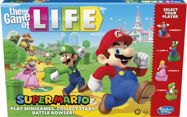 In The Game of Life: Super Mario Edition board game, players choose to play as Mario, Luigi, Peach, or Yoshi, journeying through the Mushroom Kingdom, and finally spinning to win in a battle against Bowser! They move around the looping paths of the gameboard as they collect coins, power up with items and Companions, and play fun minigames along the way such as Rock Paper Scissors, Thumb Wars, and Spin-Offs. As they approach Bowser's Castle, players will also buy stars to boost their battle-spin; each star collected adds 1 point to their spin total, and players will need to spin higher than a 12 to defeat Bowser and win the game. This fun game for kids and families is for 2-4 players.