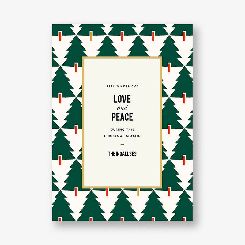 Fir trees decorate this card, surrounded by a light gold border encompassing your message.