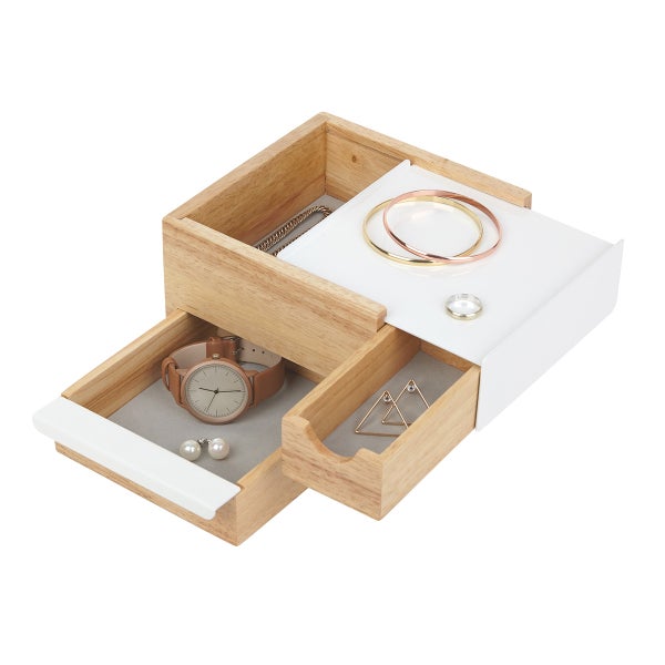 Features, Benefits, and Reasons to Buy the Mini Stowit Jewelry Storage Box: Made of rubber wood and steel. Top tray slides to reveal 2 hidden compartments. Padded linen-lined drawers. Non-shifting, non-scratching rubber feet. Compact design fits perfectly on your dresser, vanity, or countertop. Perfect for storing a variety of jewelry, including rings, earrings, necklaces, and bracelets. Keeps your jewelry organized and tangle-free.