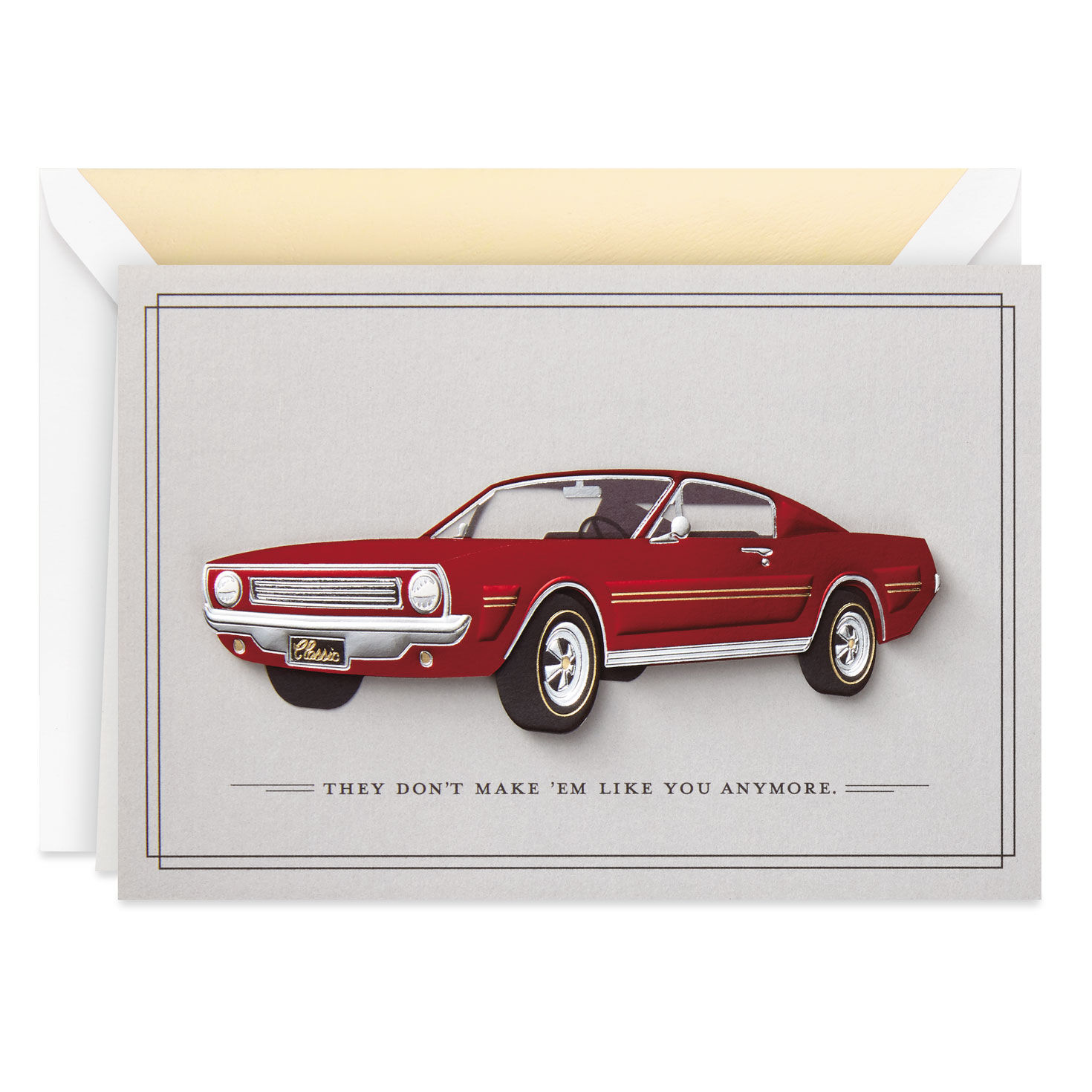 Birthday greeting card features a three-dimensional design of a shiny red and silver classic car paired with a fun message. Foil and embossed accents with a 3D die-cut attachment.